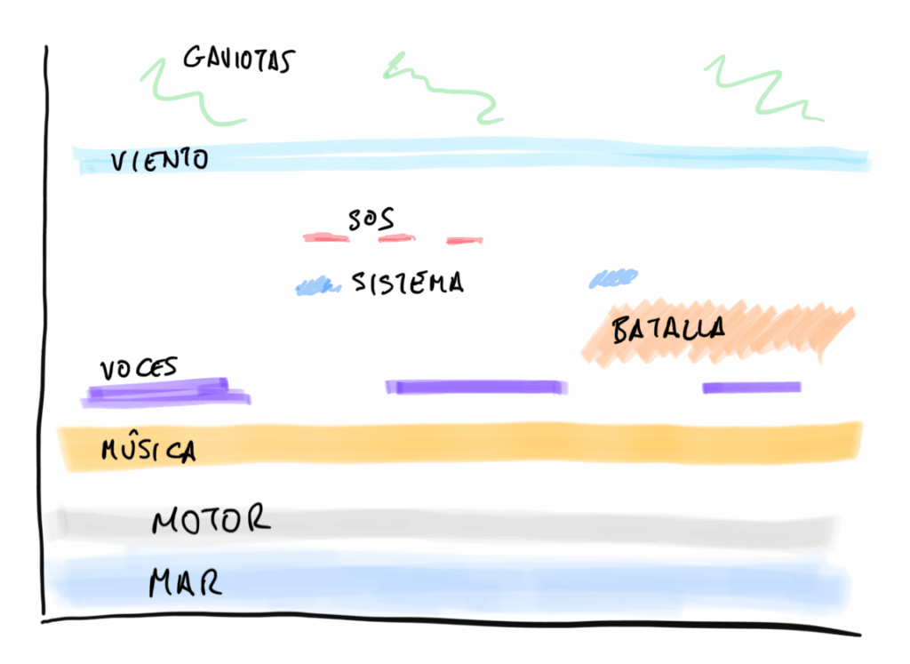 Taking into account the different elements that will coexist in the soundscape, we can prepare a sketch of it. The different spaces they occupy in it will depend on the time they are playing, their volume and their frequency (in Hz).