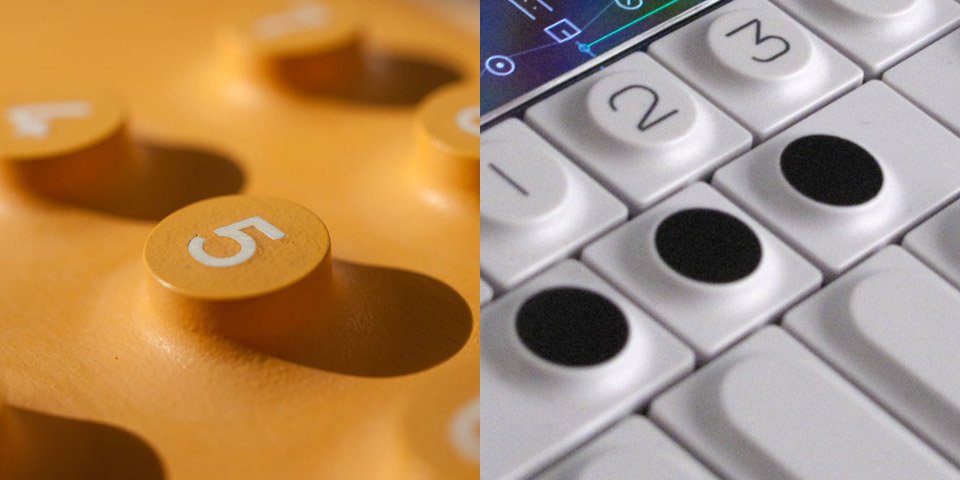 The next thing that catches attention are the buttons and keys (far from the classic shape and arrangement of black and white keys). They've clearly been molded in the image of the buttons from the Divisumma that Mario Bellini designed for Olivetti in 1972.