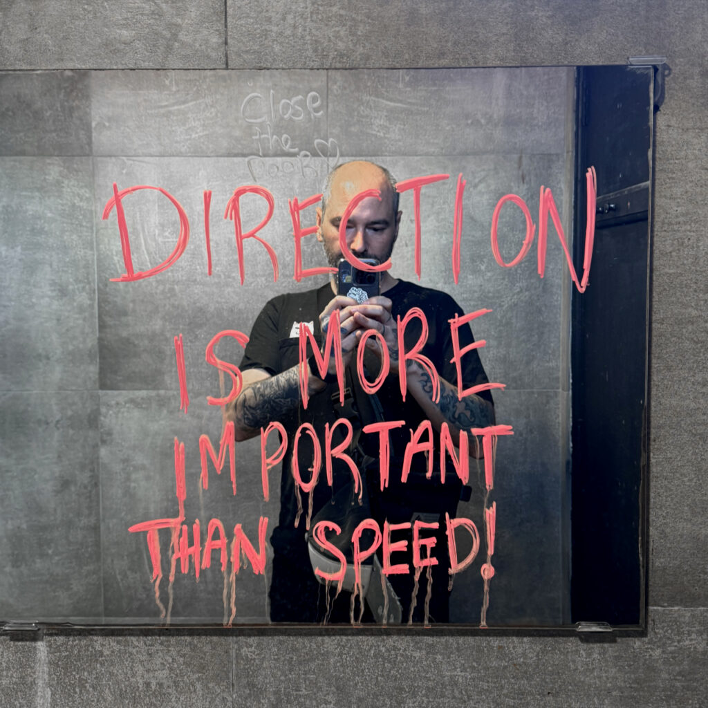 On one of those aimless walks that characterize my travels, I entered a café in Singapore to escape the heat. The place was called Rough Guys Co., and in their bathroom I found something that stopped me. On the mirror glass, with thick strokes and dripping paint, there was a written phrase: "Direction is more important than speed."
