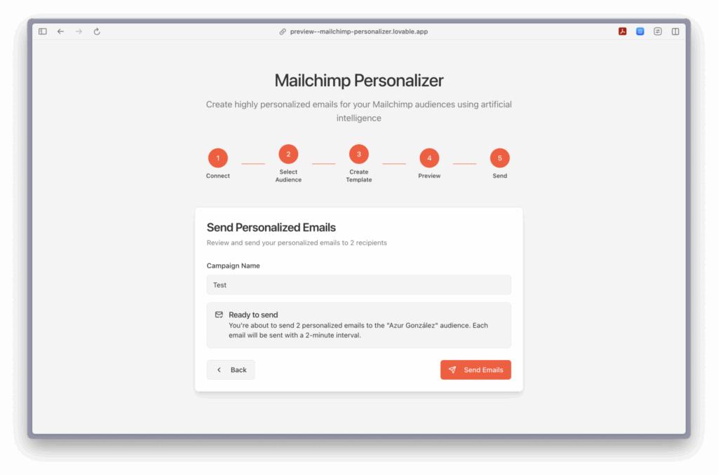 A couple more prompts and I had a complete system for Mailchimp connection, audience selection, basic email personalization and mass sending.