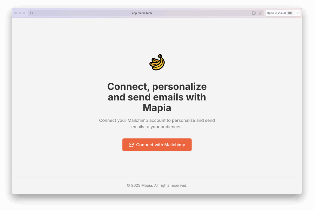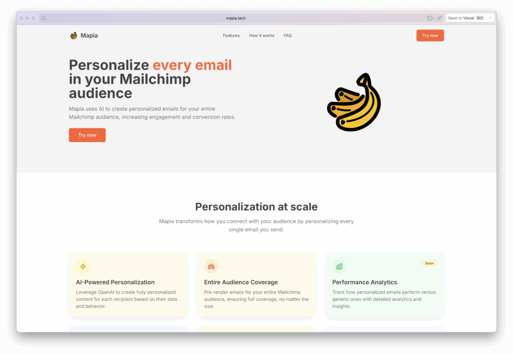 A presentation landing page for the product was missing. I decided to try v0, an application similar to Lovable. The prompt was clear: "Create a landing page for Mapia, a new digital product. This product helps users personalize emails for their audiences in their Mailchimp accounts —not just one email, but each one individually— with OpenAI's help." I gave it the colors and Linear's minimalist style.