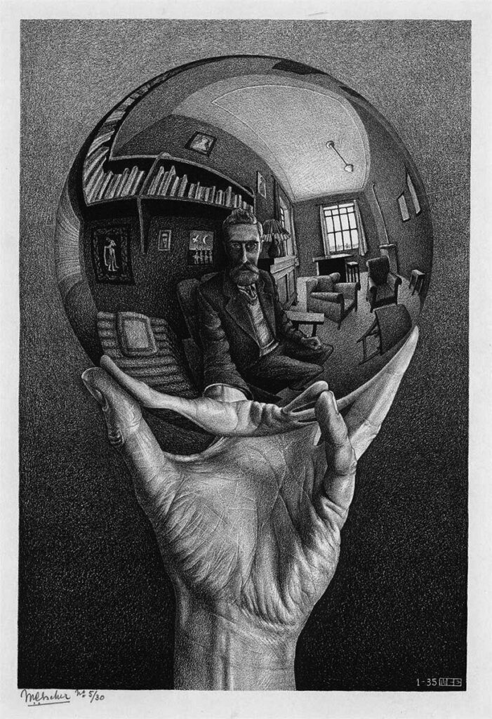 In this self-portrait, Escher distorts reality to accommodate it to the distorted spaces that form his work. As Wikipedia rightly says: "paradoxical spaces that challenge the usual modes of representation".